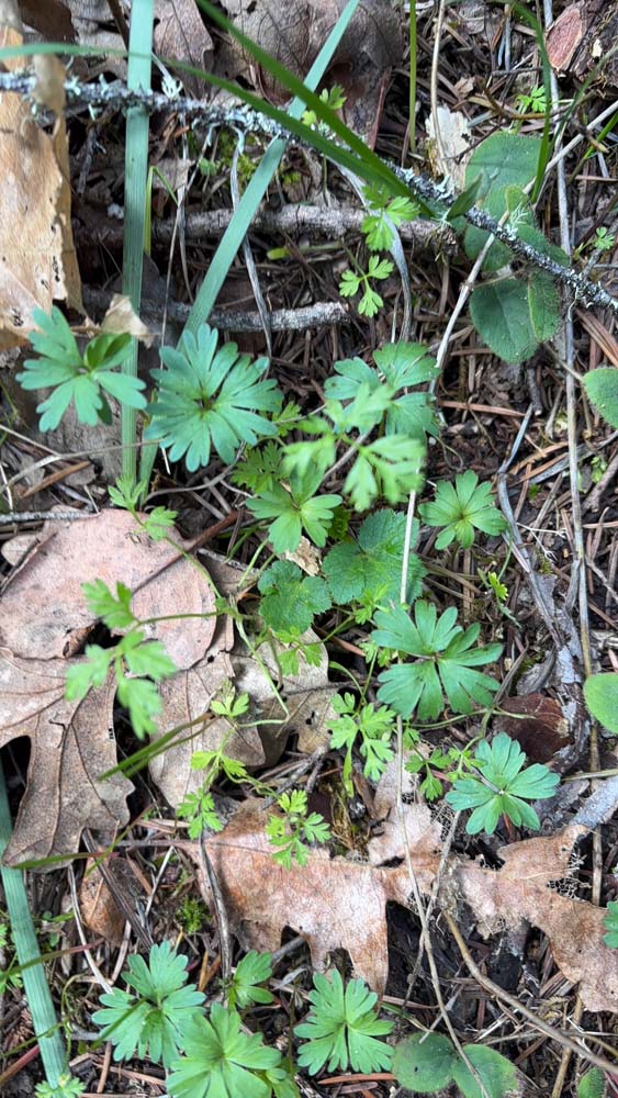 The journey was in shade, but a sunny area presented for lunch. Young wildflowers were making their appearance, including shooting stars, milkmaids, western rattlesnake plantain, Nuttall’s toothwort, Shelton’s violet, hounds’ tongue, and Oregon grape. The lake was quiet, but for a couple of individual fishermen on sit-on-top kayaks. Crows enjoyed a conversation we couldn’t translate but sounded friendly. Elisabeth’s injured Achilles tendon from our last snowshoe hike needed a light hike, so she stopped early to meditate on an outcrop near lake edge. There she found a large shelter/’fort’ built of driftwood. She’s hiked just 2¾ mile RT. Alison took the group onward for a 4¾ RT hike, meeting up with the lame one near hike end.