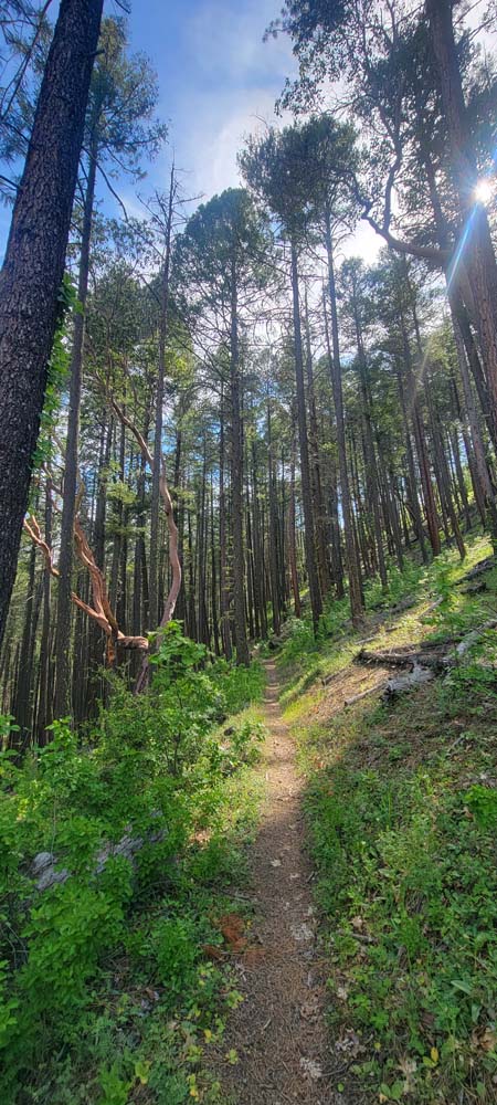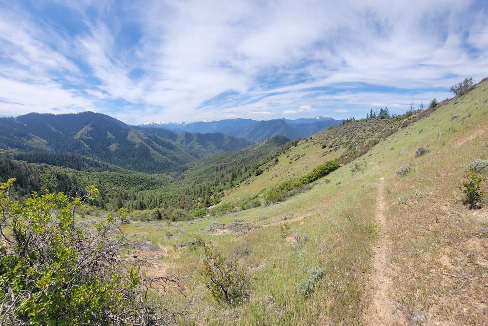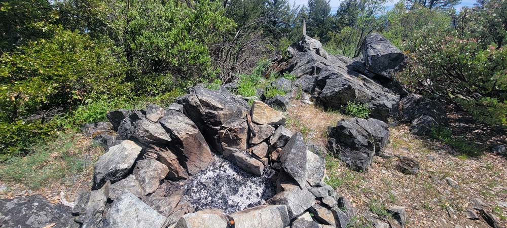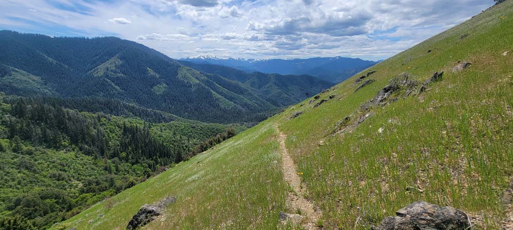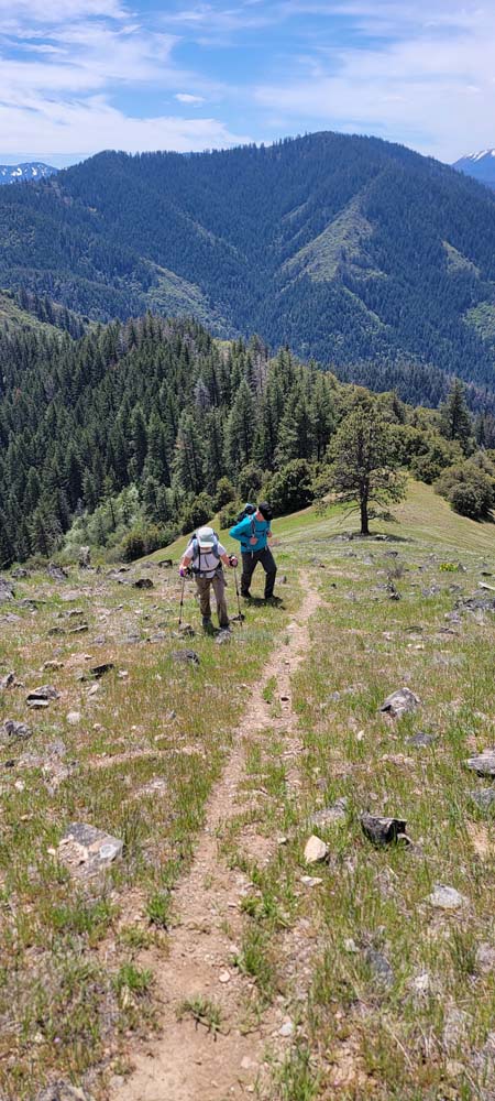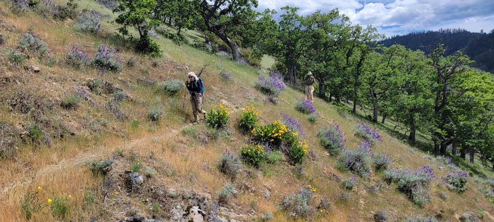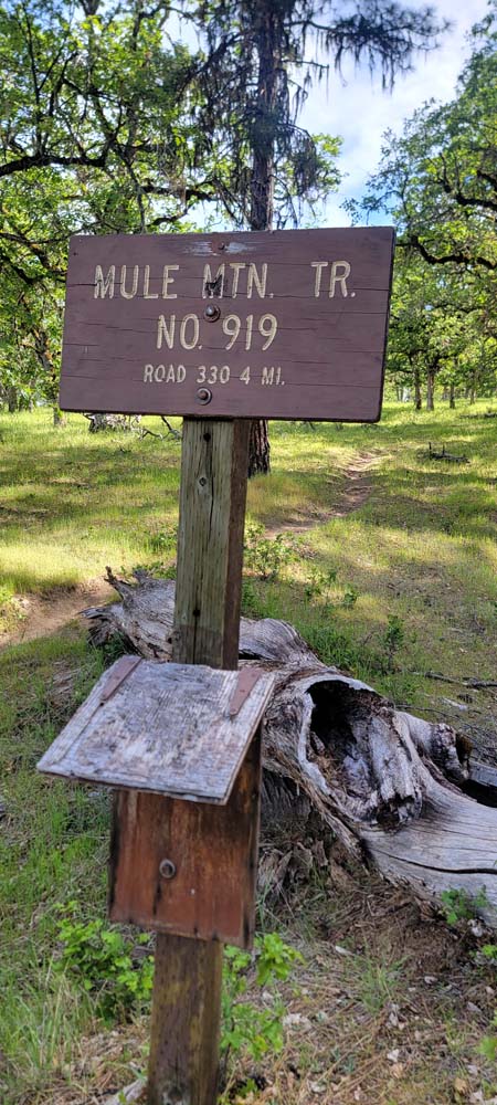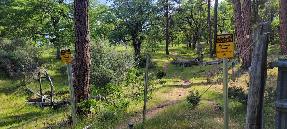 On Wednesday we had 4 hikers come out to hike to Baldy Peak from the Mule Mountain trail located off Upper Applegate Road. For several years, landowners closed access to the trail. A new approach has been made so we can now do this hike instead of Charlie Buck trail. I had just recently heard of the access so planned the hike right away. I had forgotten how warm it gets and will schedule it either in the fall or the earlier spring. It was 64* by the time we started a little after 10:00 AM. Before we started the hike, I sprayed everyone's pant legs and shoes with a natural tick deterrent for dogs. On the new access trail, we had a bunch of cows on the other side of the fence that seemed very curious about us. When we got to the Mule Mountain trail, there were 2 private property boundary signs.