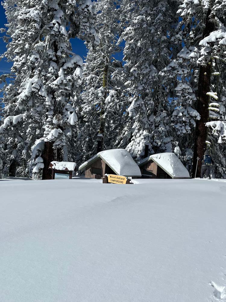 We started by meeting at Rite Aid to decide where we should go. The weather looked good, so we thought snowshoeing at Mount Ashland would be a good idea. We passed the parking area for Bull Gap and the road was still clear so we headed up to the ski lodge and parked beyond it at the Grouse Gap sno-park.