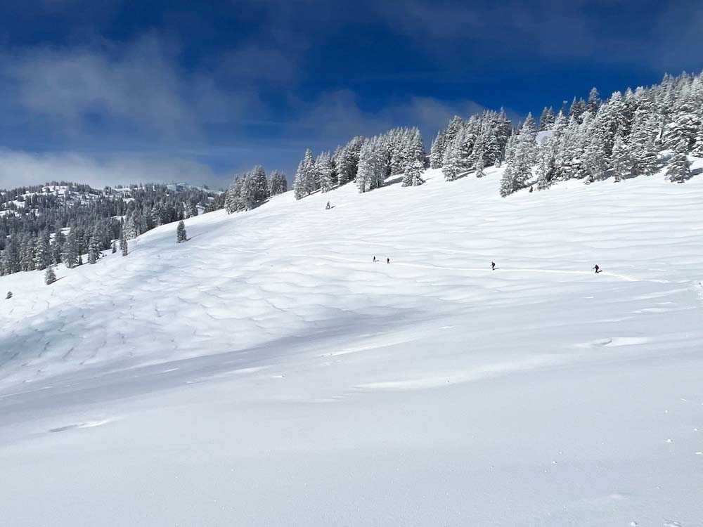 As we began our trip it was around the mid 30° with sunshine and lots of new snow. FS 20 had not been groomed so it was a little difficult making our way in the snow towards the Grouse Gap warming shelter. We took turns breaking trail and tried to keep the ground as even as possible by stepping in areas not yet flattened.